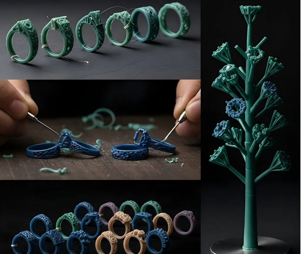Designing the ring/pendant/earrings → creating wax model (hand-carved or 3D-printed) → lost-wax casting in precious metal (silver, gold, or platinum).