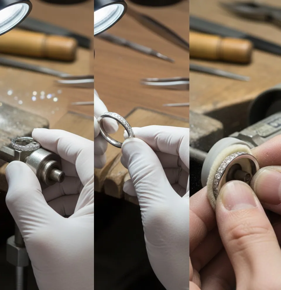 Securely setting the polished moissanite into the metal mounting → final polishing → rhodium plating (if white gold) → thorough quality control → ultrasonic cleaning and packaging.