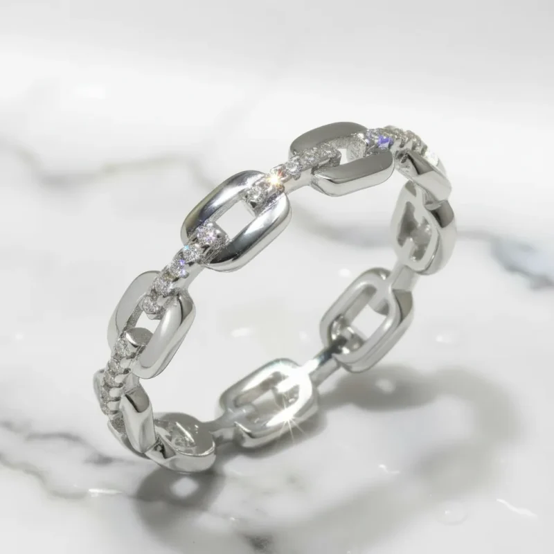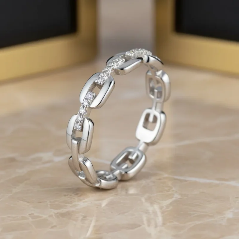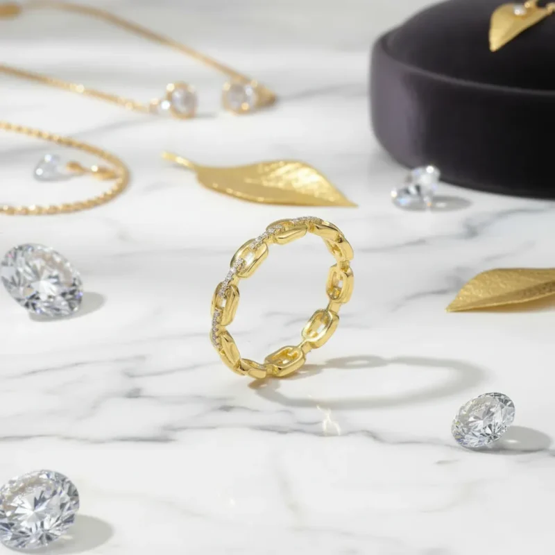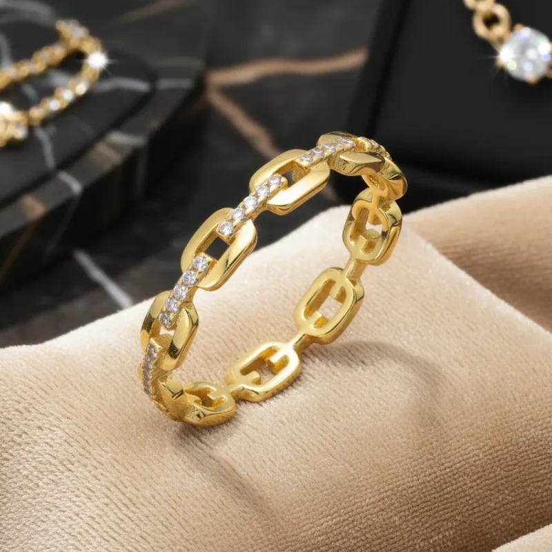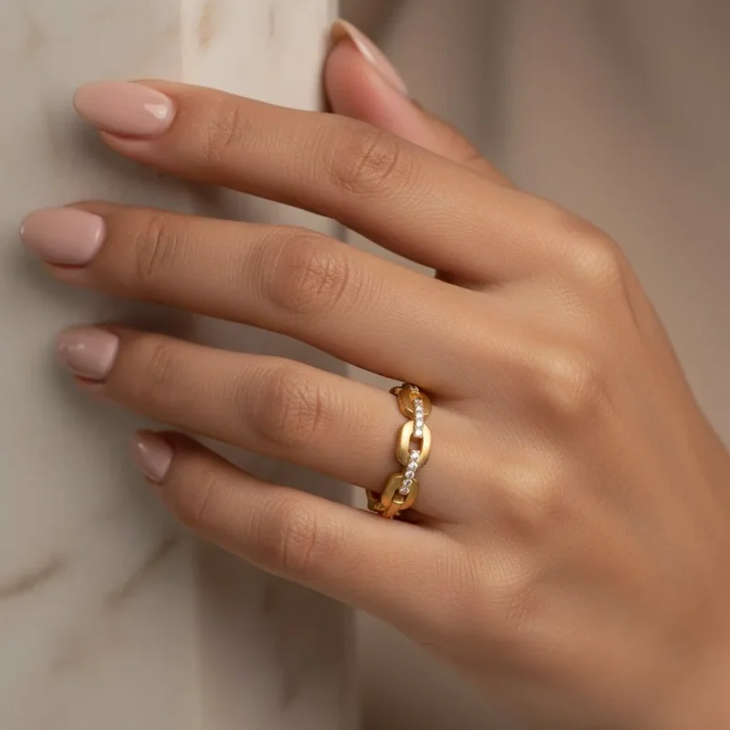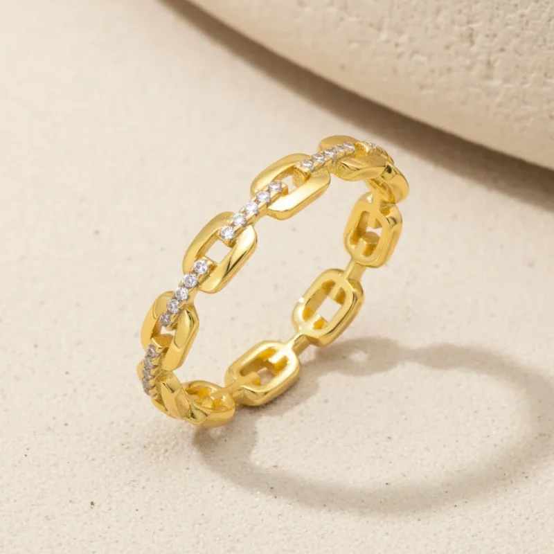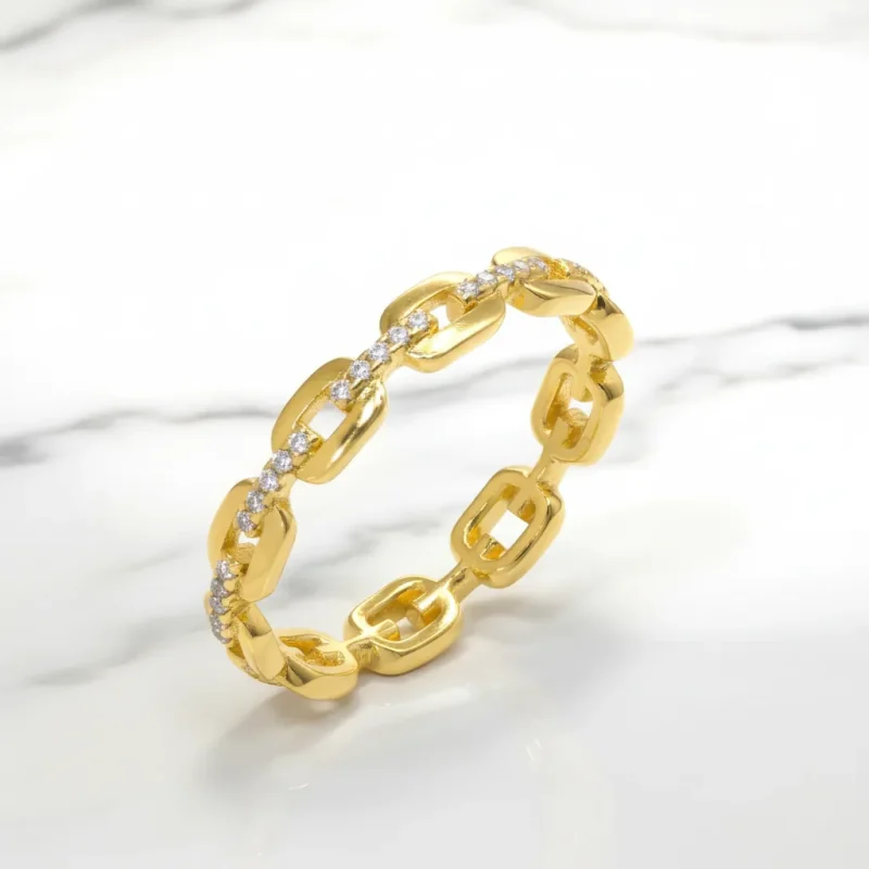 The gold chain ring features a delicate, interconnected chain motif, blending modern edge with timeless gold allure.